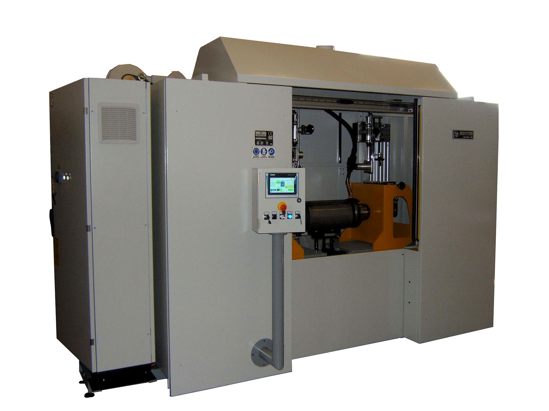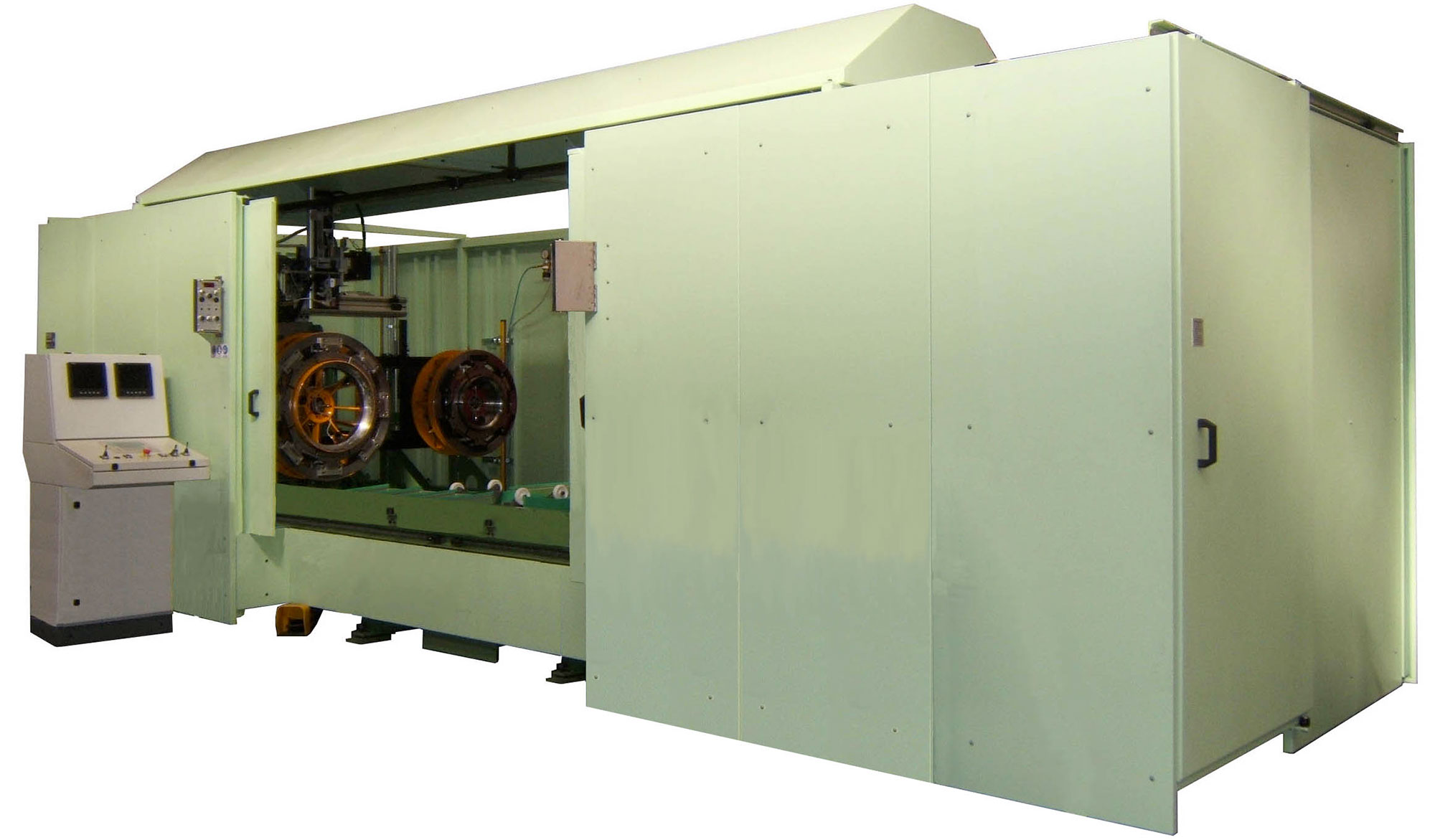 Impianto per la saldatura circolare, con accoppiamento in testa a testa di fondi con fasciami. Esegue l’accostamento e il bloccaggio in testa a testa e la successiva saldatura. Può eseguire anche la prepuntatura.